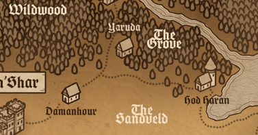 As Tuesday dawns, El(drin) prays to Soliman, before they wake the others to break camp. We follow the road to Yaruda as that's what Gladiola wants. We enter a more woody area. It's still very dry but they're taller than the shrubs around Damanhour. Chalcedony can run next to the cart at times, now that the ground is, you know, ground, instead of burning sand baking for hours in the desert sun.