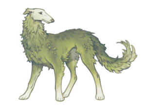Gladiola goes on: "my protector does look like a dog, right"? Ezra wonders if their eyes can stare any wider. Gladiola explains Chalcedony isn’t really a borzoi, but rather a Cù-Sidhe. These Elven dogs can grow as big as a rhinoceros, so at her size and age of 15 years, Chalcedony is still very very young, though already a great travel companion and protector. She drops the illusion on Chalcedony. (SEE IMAGES BELOW).
