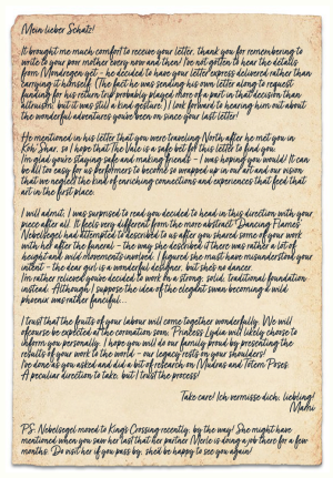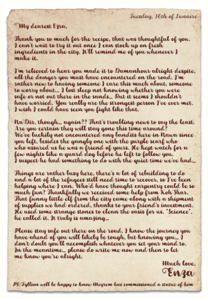 - reception of Enza's letter from Nawa (see images). Ezra flushes delicately and decides to read it in private