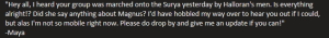 With an unexpected amount of gleeful stars in their eyes, Ezra agrees to the scam: their father appears to be trying to be better, for Ezra’s sake and for the whole family’s sake, but he was pretty shitty for a long time, so a prank like this is exactly what he deserves. We make a plan to wait till Jacob contacts Storm with news about the bag, and then the 3 of us will head over. We’ll keep pretending that only Storm is aware of the bag of holding/messaging paper exchange, but Ezra (with Jacob’s jacket) and Hali (as his nimble-fingered nurse) will distract him so the fake messaging paper isn’t discovered.