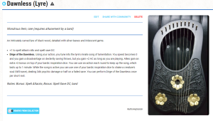 Politely Ophelia turns to the lyre, and enquires about the price. Sastruga mentions he’d prefer to give it away, but alas as a cultural leader for the Eladrin in The Vale (being old and a longtime resident and all), planning all these events for the youth requires funds… after a genteel bit of haggling, between Sastruga’s desired price of 600 gold pieces and 360 gold pieces which represent all that Ophelia owns in this plane, they agree to a sum of 450 gold pieces, as well as a performance on the unique relic from the Fey Wild Sastruga is about to hand over.