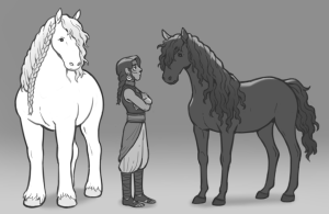- 2 horses pulling a produce wagon “did you see that horse in the inn? They say she pulls a whole house all by herself, and with an ass that fat I’d believe it, yowerz” (see images)